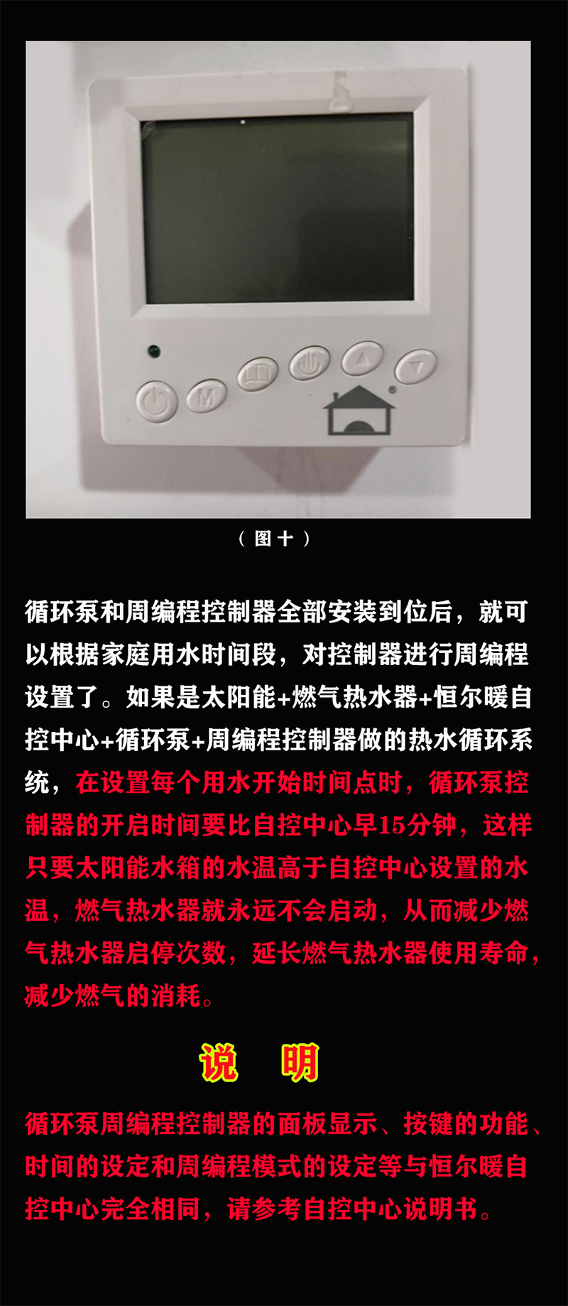 2、如果安装于太阳能+燃气热水器+恒尔暖自控中心的热水循环系统中,自控中心安装在燃气热水器下方,循环泵及控制器套件安装于太阳能水箱回水口处,自控中心和循环泵分开安装,控制更加理想。周编程设置时,每个用水开启的时间点,循环泵的开启时间都设置成比自控中心早15分钟,这样,只要太阳能水箱的水温高于自控中心设定的温度,燃气热水器都始终不会启动,大大减少燃气热水器启停次数,延长燃气热水器的使用寿命,也减少燃气用量。
