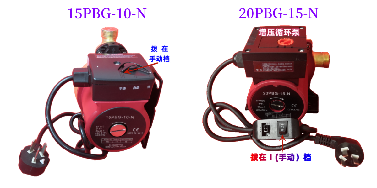 20PBG-15-N型号增压循环泵设置手动档在电源线控制开关处,Ⅰ档为手动档,Ⅱ档为自动档,O档为关闭。