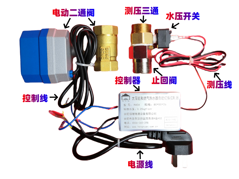 该自动切换器由水压开关、止回阀、电动二通阀和控制器等组成。将水压开关和止回阀安装在太阳能下水管道上,将电动二通阀安装在燃气热水器进水口上。