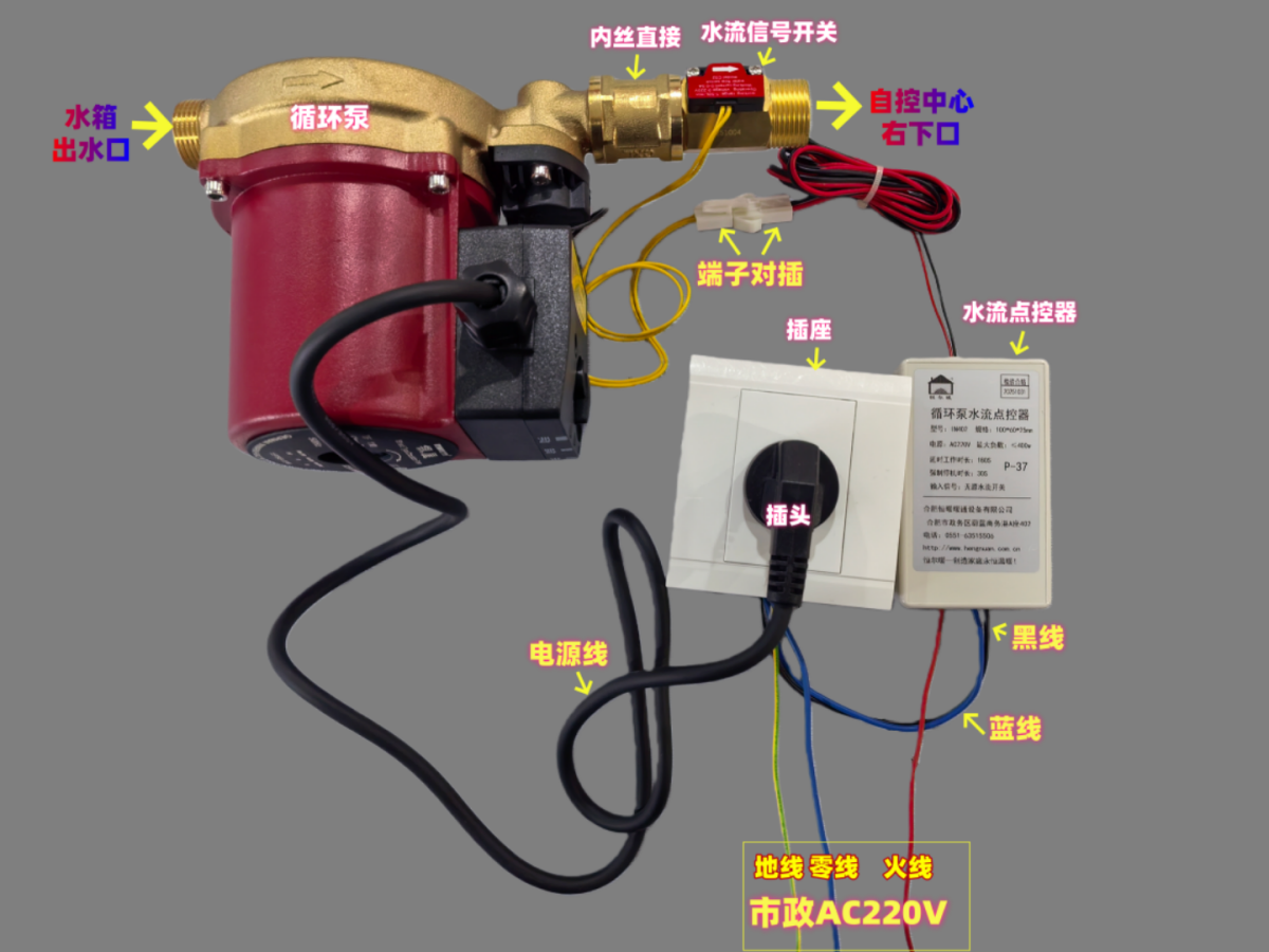 循环泵通过水流点控器供电,接线时需注意火线、零线与地线的正确连接,确保用电安全。