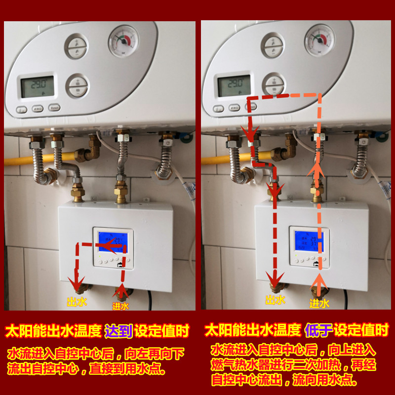 这样既避免了空气能(或太阳能)热水器和燃气热水器两边都安装阀门和每次手动切换的麻烦,又能在空气能(或太阳能)出水温度不够时进行二次加热,减少直接用自来水加热的能源浪费。自动控制,方便,舒适,节能。