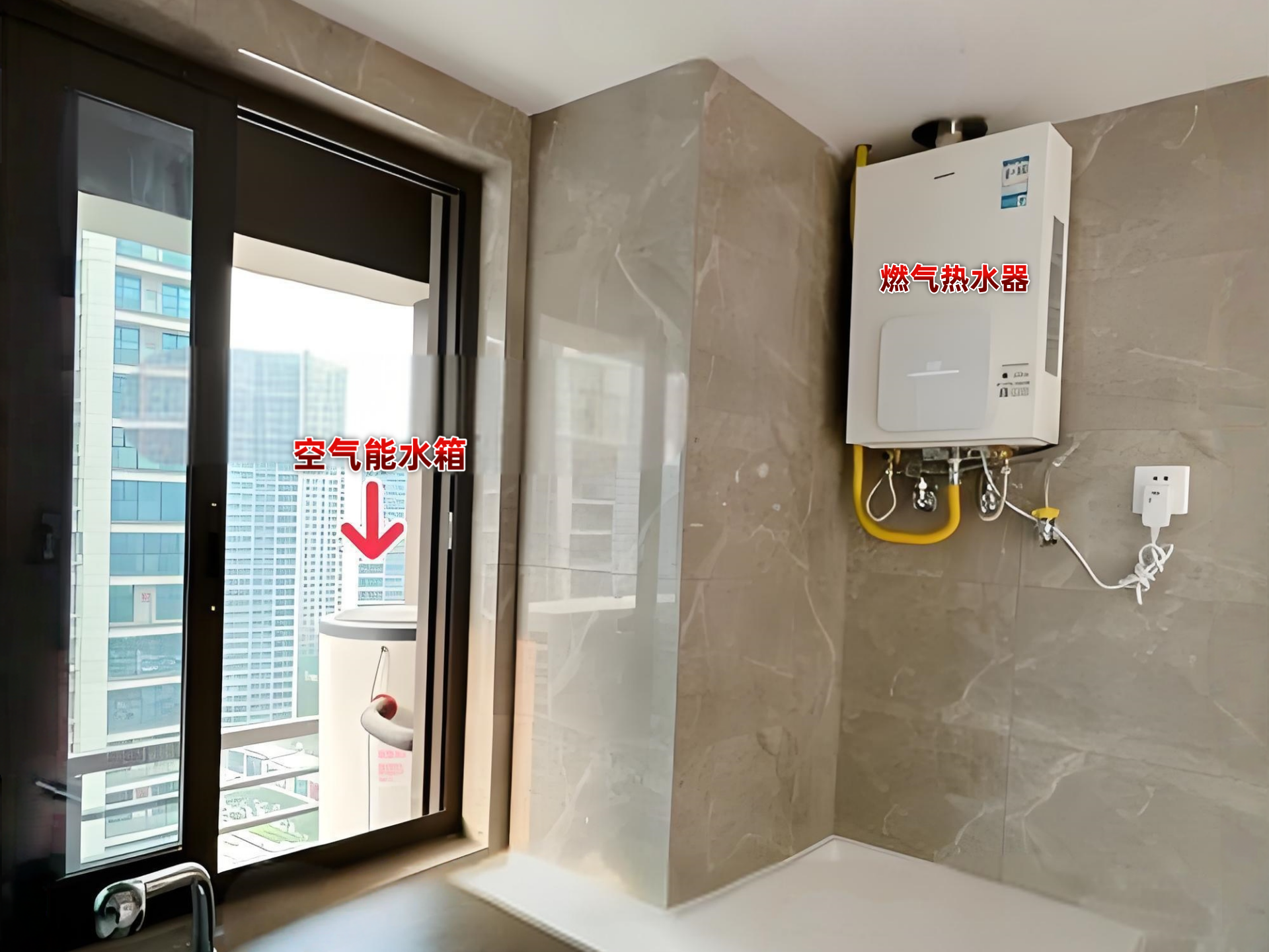 注意事项:若空气能水箱与燃气热水器距离过远(如隔多个房间),或墙体 / 结构不允许打孔,则不适合此方案,需转用方案二。