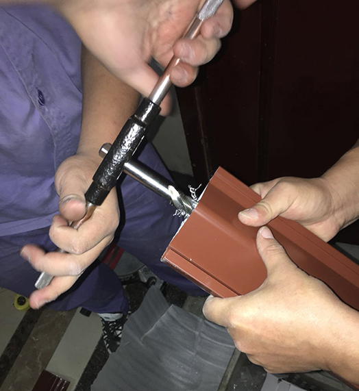 第八步,切割、攻丝踢脚暖。师傅们根据每面墙的长度切割拼接踢脚暖,然后将每根踢脚暖两头攻丝。