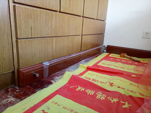 第五步,贴保温反射膜。在墙体安装踢脚暖的位置粘贴一种珍珠棉保温反射膜,避免热量被墙体吸收,他们用塑料膨胀管从保温反射膜外面插入所打的挂板孔里,即固定了保温反射膜,又为固定挂板打基础。