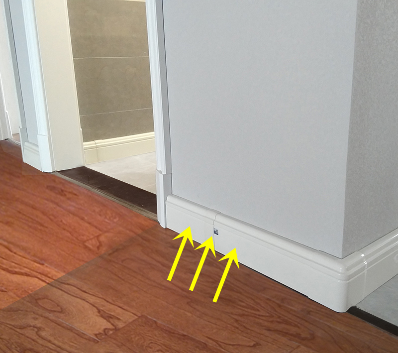 他们说,只要把家里原来的踢脚线拆除,换成这种可以供暖的铝合金踢脚线,供暖系统的管道从踢脚线和墙面之间布置,被踢脚线完全隐藏了起来,从一个房间到另一个房间过墙打孔通过,而且和电线布置一样采用并联方式,每个房间一个回路,还可以装上阀门,也可以像毛坯房一样分室控温,不用的房间也可以关闭,不用过室内几个门,墙面上几乎看不见一点管道,一点也不破坏原来的装修。