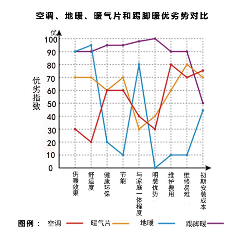 (空调、地暖、暖气片和银屋踢脚暖优劣势对比表)