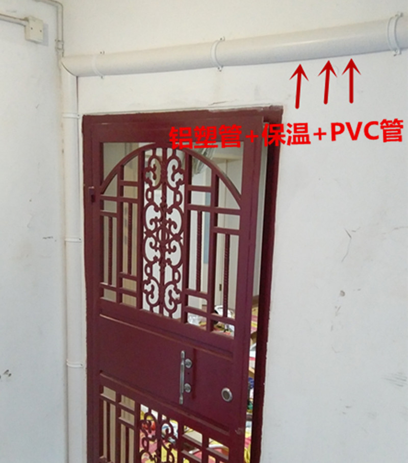 (供暖主管从室外门上绕过,套上保温管在卡上半个PVC管)
