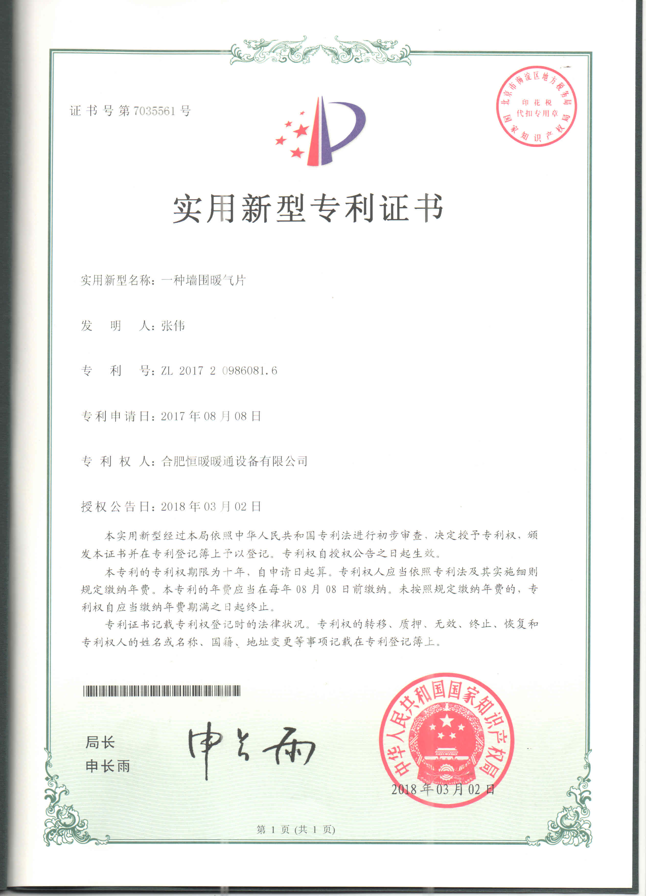 最后,张总说他们开发的这种薄型墙暖已获得6项实用新型专利授权,他们会尽快将这种新型装饰性暖气推向全国,使更多的家庭尽快享受到这样美观高效安全方便的暖气设备。