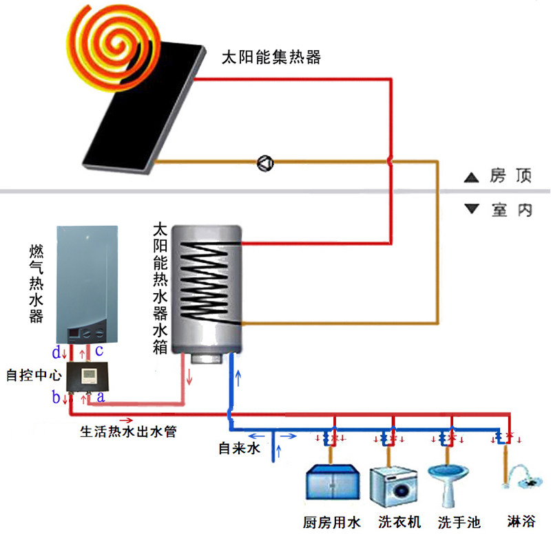 大家知道,太阳能热水器因为利用的太阳光免费制取热水,是十分节能的热水器,所以被广泛地使用。但它也有一个重大的缺点,这就是:如果连续几天没有阳光或阳光不足,太阳能热水器就无法使用。为了生活方便,很多家庭再另外安装一台其他热水器,如:燃气热水器(含燃气壁挂炉,下同)或电热水器,在太阳能热水器不能使用时,就开启这台补充的热水器,平时在太阳能热水器可以使用的时候,就关闭这台热水器,这样既节能,又不影响使用。
