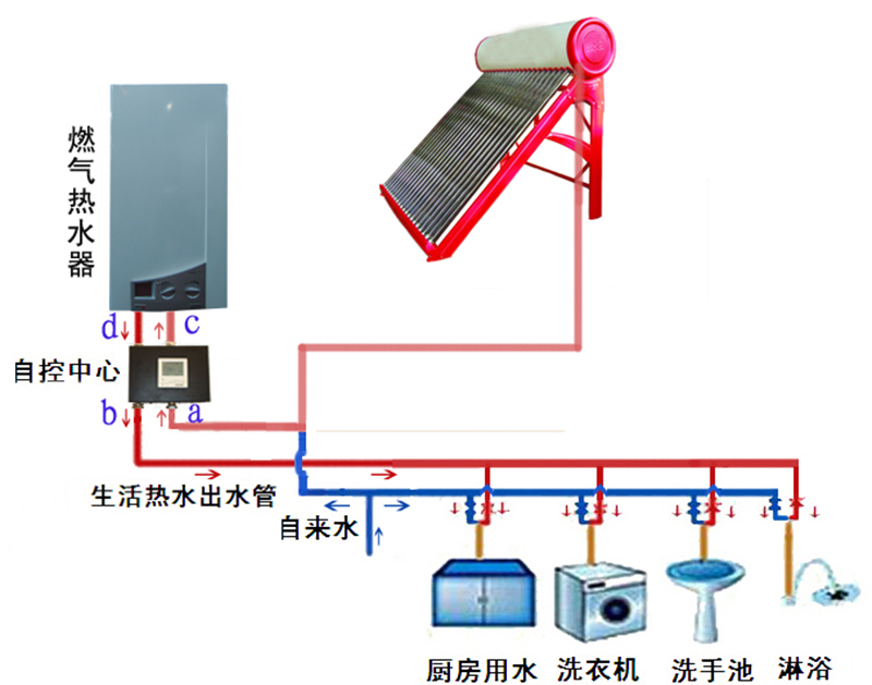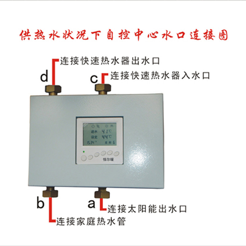 为解决上述所说的问题,合肥恒暖暖通设备有限公司发明了“太阳能+快速热水器自控中心”。该自控装置能用户在使用热水时,根据设定水温与实际水温的对比,智能切换太阳能热水器与快速式热水器(燃气热水器、燃气壁挂炉或即热式电热水器等),在太阳能热水器的出水水温能够达到设定温度时,不开启快速式热水器,当太阳能出水温度达不到设定温度时,自动开启快速式热水器,这时太阳能热水器流出来的水再通过快速式热水器进行二次加热。这样既节能又十分方便,无需再人工手动操作。