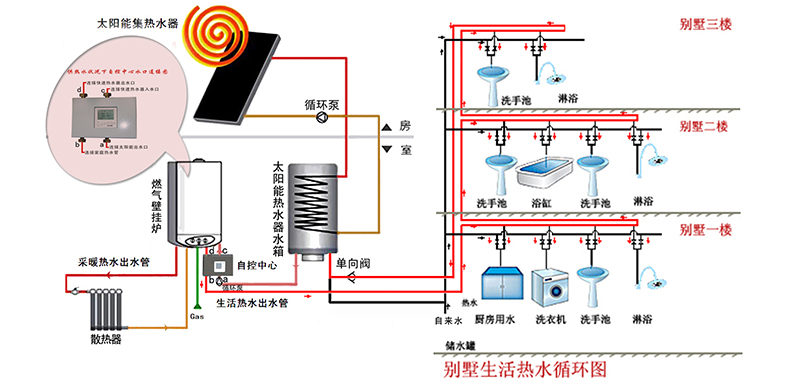 (别墅承压式太阳能+燃气壁挂炉+恒尔暖自控中心智能热水循环系统)
