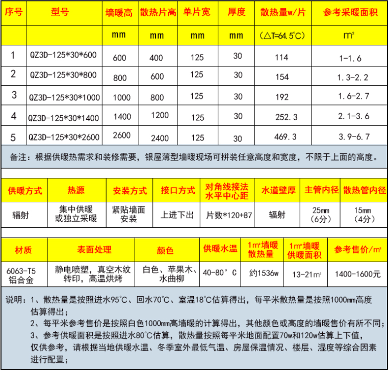 作为新品,供暖效果这些基本的东西,必然是充分考虑到,否则拿什么来和已经推广使用多年的传统采暖产品竞争?以德国银屋暖通国际型号QZ3D-125*30*1000的墙暖为例,其宽125mm,厚30mm,高1000mm,散热量能够达到192w/片,采暖面积在1.6-2.7㎡之间。按照进水95℃、回水70℃、室温18℃,墙暖高度为1000mm来估算的话,1㎡墙暖的散热量大约是1536w,1㎡超薄墙暖的供暖面积在13-21㎡之间,这样的参数已经足以说明墙暖的供暖效果到底好不好。