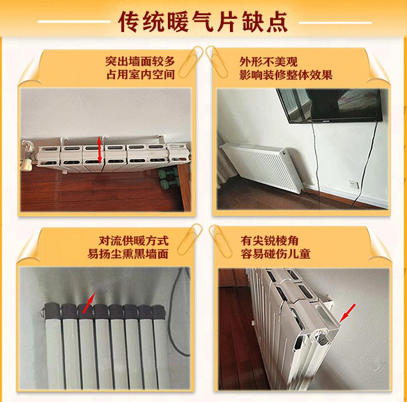 传统暖气片突出墙面较多,占据室内空间,影响家具的摆放;外形不美观,破坏装修的整体效果;对流式供暖,易扬尘熏黑墙面;有尖锐棱角,容易碰伤活泼好动的儿童。