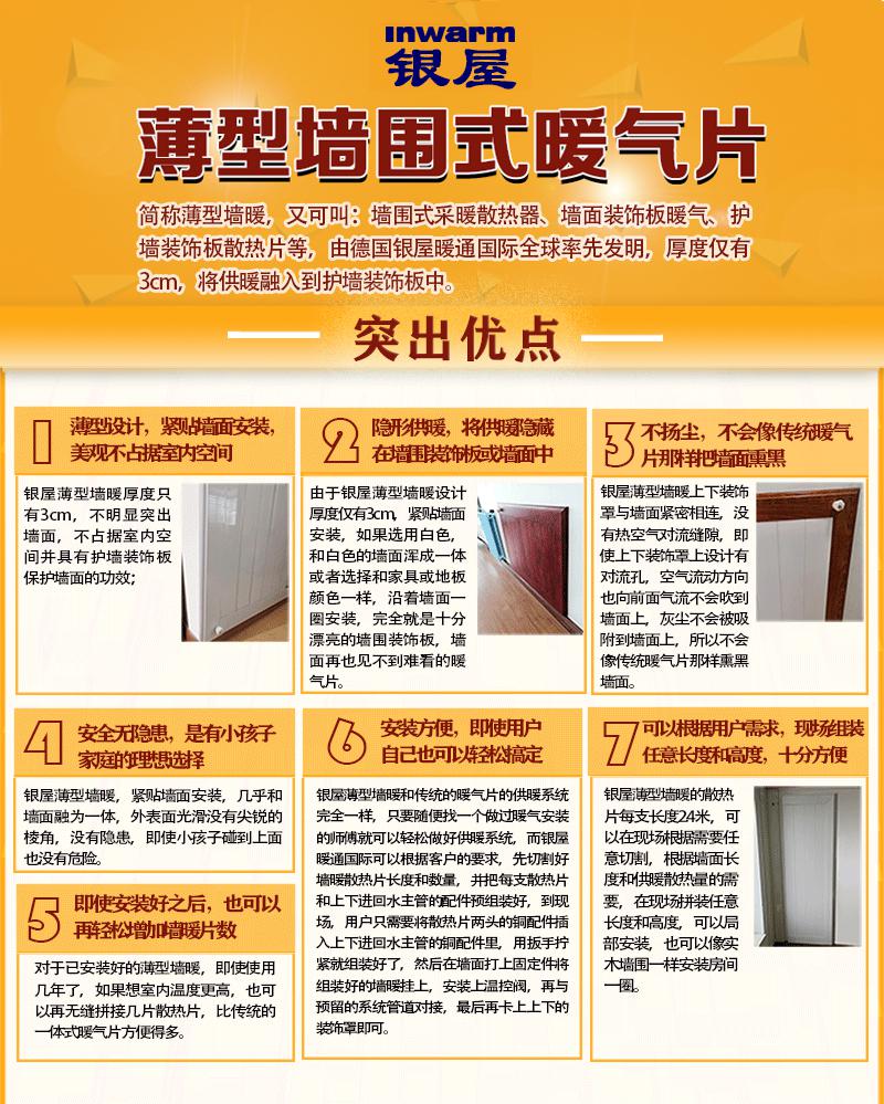 银屋装饰护墙板暖气片,厚度只有3cm,只有传统暖气片的1/4-1/5的厚度,紧贴墙面安装,美观不占据室内空间;隐形供暖,外观看起来就是墙面或护墙装饰板,看不出供暖设施;无尖锐棱角,安全无隐患,是有小孩的家庭的理想选择;辐射供暖,不扬尘,不会熏墙墙面;安装方便,可以根据客户需求现场组装任意高度和宽度;即使安装好后也可以很方便增加片数,而且是无缝拼接。