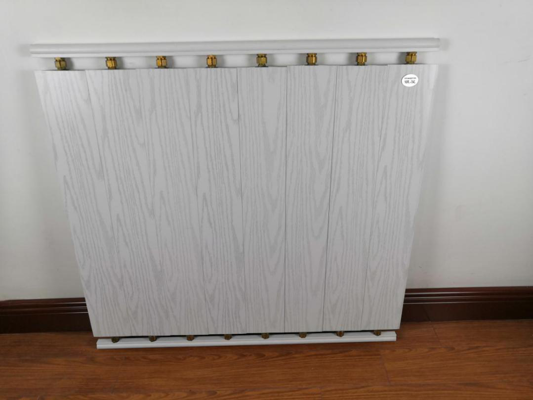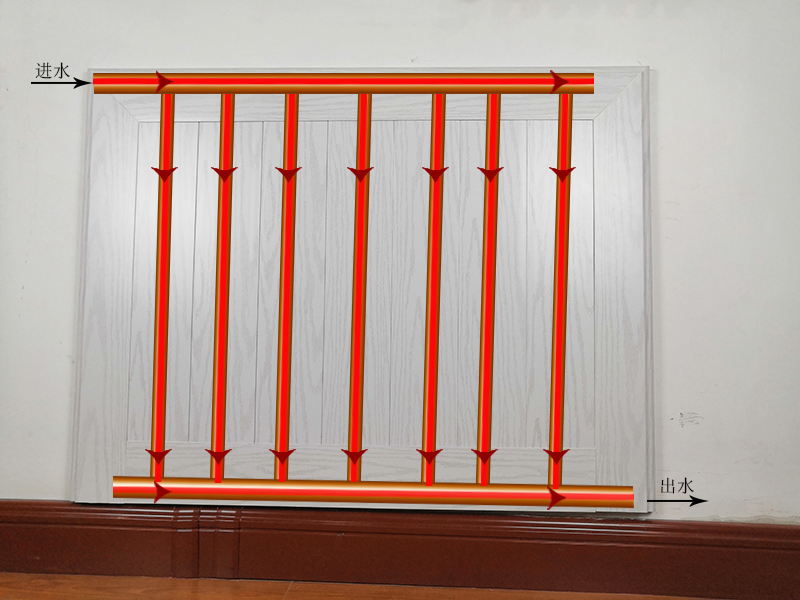 和传统暖气片一样也是水暖,供暖时,热水通过系统管道输送到主管内,然后分流到每片散热片支管,向下流动,汇集到下面的主管内,再流出墙暖到系统回水管,从而周而复始,热水通过墙暖内部流动时,热量通过水道壁传递给翅片,再传递到前面板,然后以热辐射的方式向室内进行散发,从而加热室内空间。