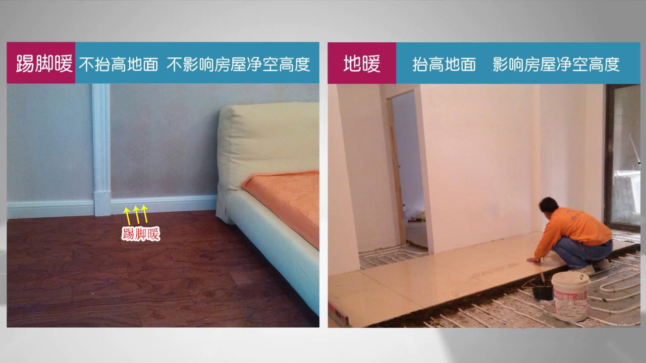 (地暖抬高地面和银屋踢脚板采暖对比图)