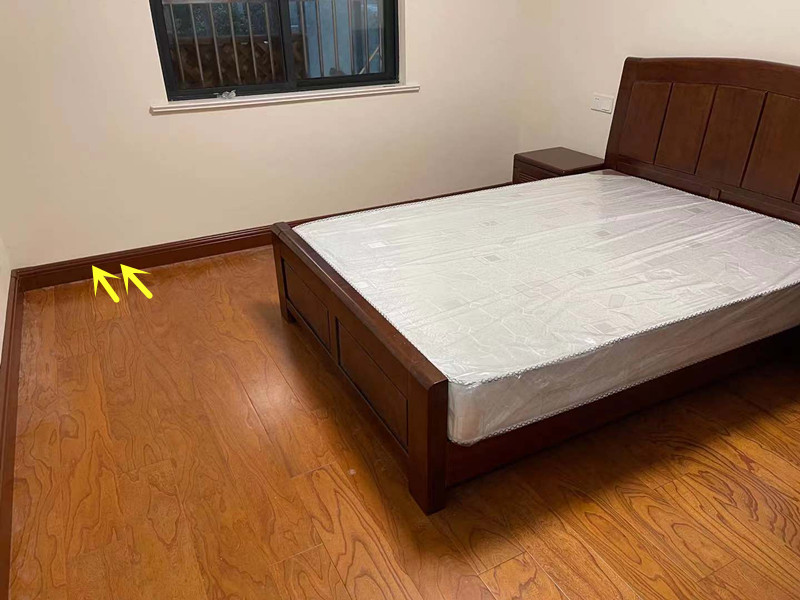 在选择银屋踢脚板水暖的时候,可以根据房屋的装修风格和地表面装饰材料颜色不同,选择合适颜色的踢脚板水暖,这户业主家卧室安装的实木地板,选择和地板相呼应的深棕色踢脚板水暖。