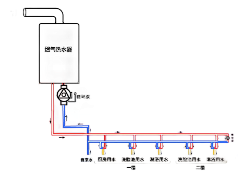 与燃气热水器出水口连接的热水主管,依次经过各个用水点,分别接出支管与水龙头连接,直到最后一个用水点继续向前布置,回到燃气热水器的冷水入口,这一段管道被称之为回水管,自来水利用三通与回水管连接,并在三通和最后一个用水点之间安装一只单向阀,水流方向指向燃气热水器冷水入口。