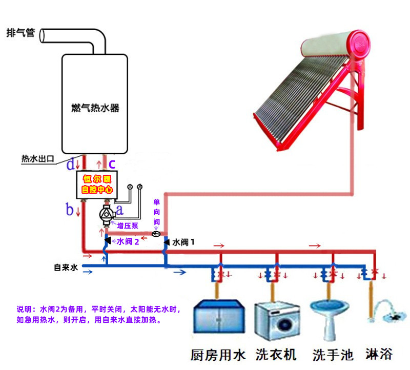 这种太阳能和燃气热水器串联的设计,实际上不多。这种设计的,如果太阳能热水器的出水管是先到燃气热水器处,之前没有用水点的,可以通过安装“恒尔暖自控中心”达到智能控制。详细了解,请点击本蓝色字链接安装也十分简单,只要在燃气热水器的进出水口和墙面预留的冷热水口之间,串接上“恒尔暖自控中心”,就能实现智能控制了。当太阳能的出水温度够时,热水就直接到用水点,当水温不够时,会自动经过燃气热水器二次加热后再到用水点,只要设置好自控中心的水温,就能全自动控制,无需手动切换2台热水器的阀门。