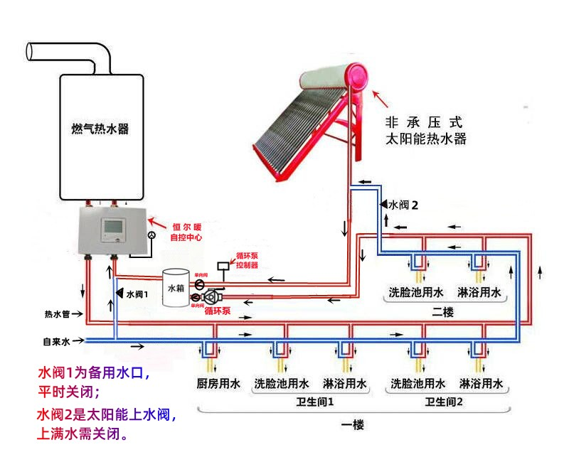 非承压式太阳能和燃气热水器组合并配套恒尔暖自控中心合循环泵热水循环系统的设计